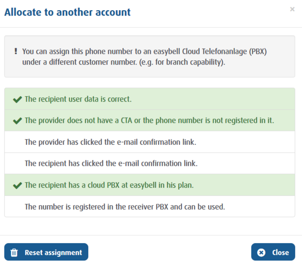 By assigning telephone numbers of one customer number to the Cloud Telefonanlage of another customer number, telephone numbers of different area codes can be managed and used within one single Cloud Telefonanlage.