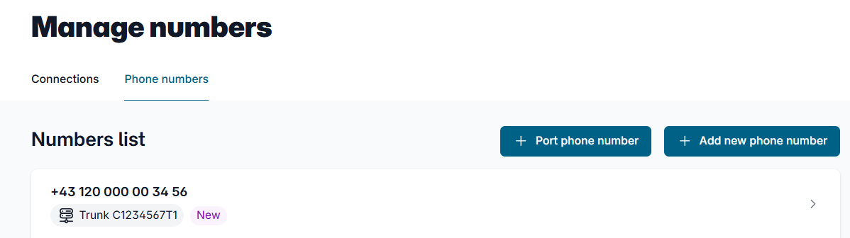 Under “Phone Settings” → “Manage numbers” please switch to the “Phone Numbers” tab. You will find an overview of your numbers.