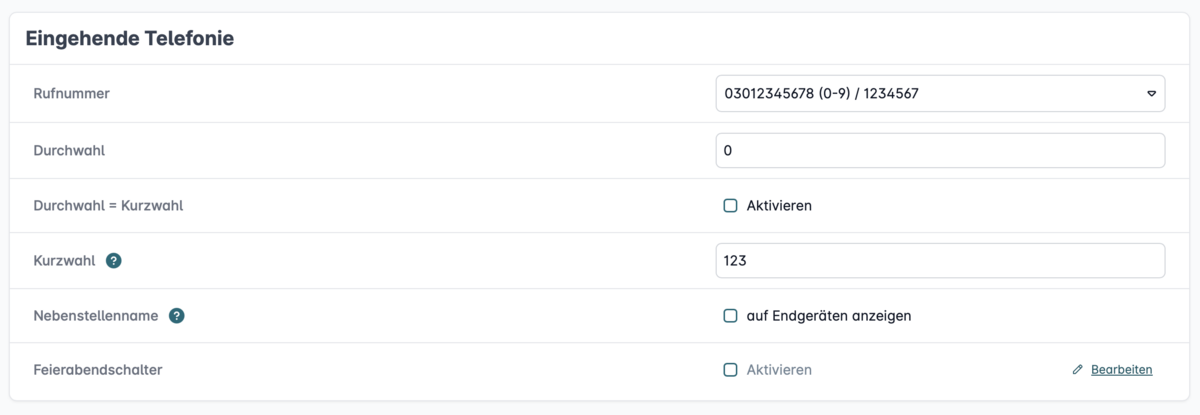 Wollen Sie die Funktion wie gewohnt nutzen, aktivieren Sie diese bei den Einstellungen für eingehende Telefonie der jeweiligen Nebenstelle / Rufgruppe. Soll hingegen nur die anrufende Nummer angezeigt werden, deaktivieren Sie die Funktion bitte sowohl im IVR als auch in den Nebenstellen.