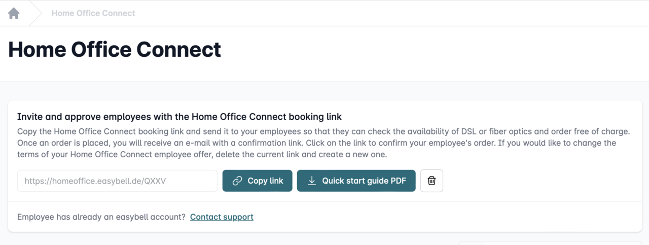 If you don't yet have an Internet or VoIP connection with Easybell or don't want one for the time being, you can book the free "Home Office Connect Hub" tariff. The employee connections are then billed via this basic account, but there are no further costs.