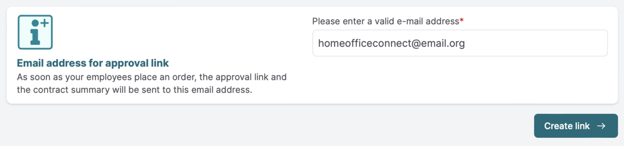Once you have customized Home Office Connect for your company, please enter an e-mail address that you will check regularly. We will send your personal order link and a contract summary to this address with every order.