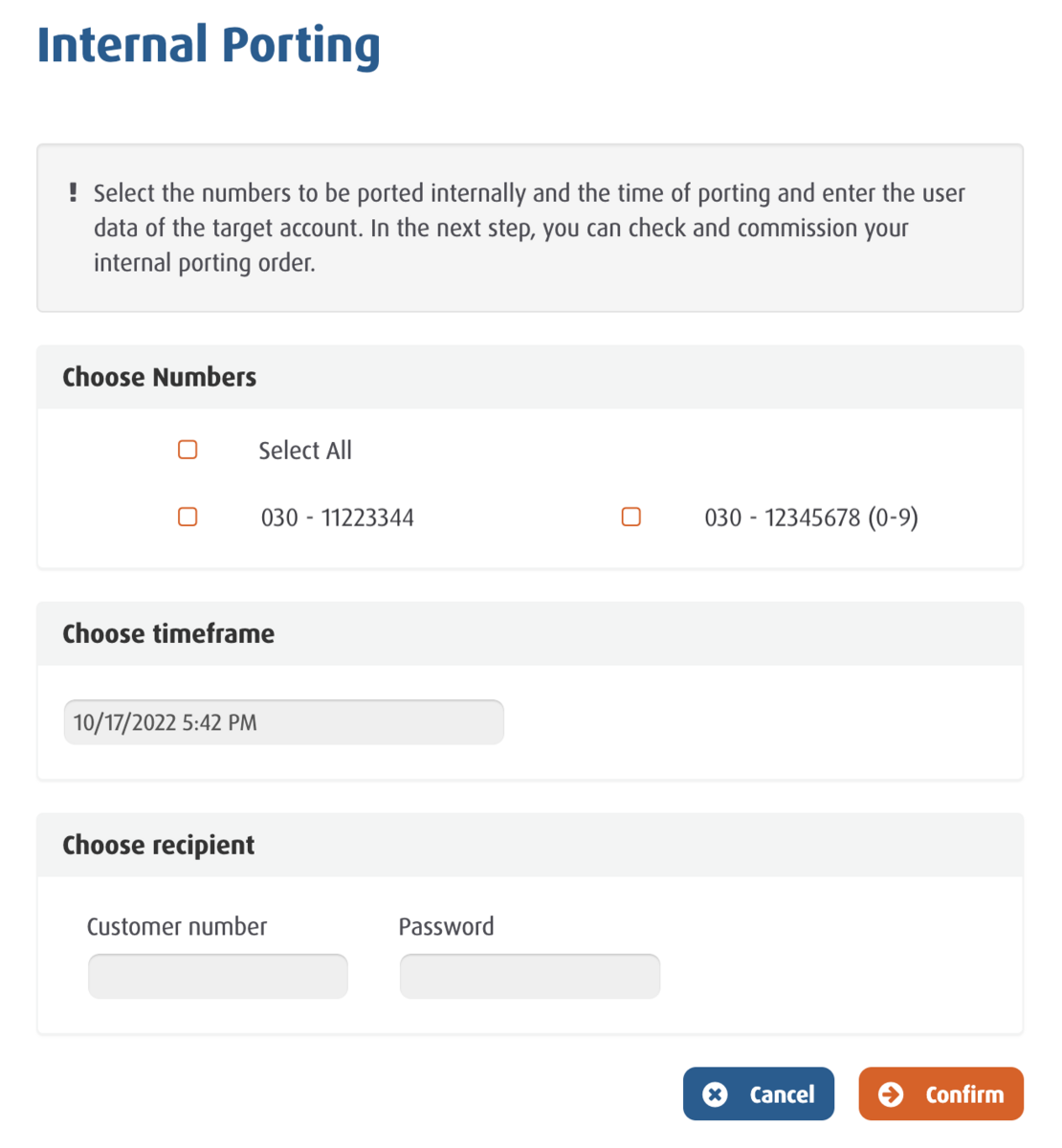 In the menu "Internal porting" you can select which numbers you want to transfer to your new connection and when.