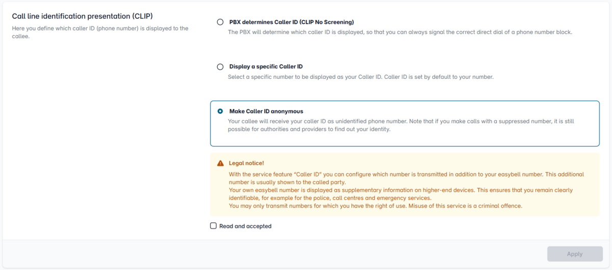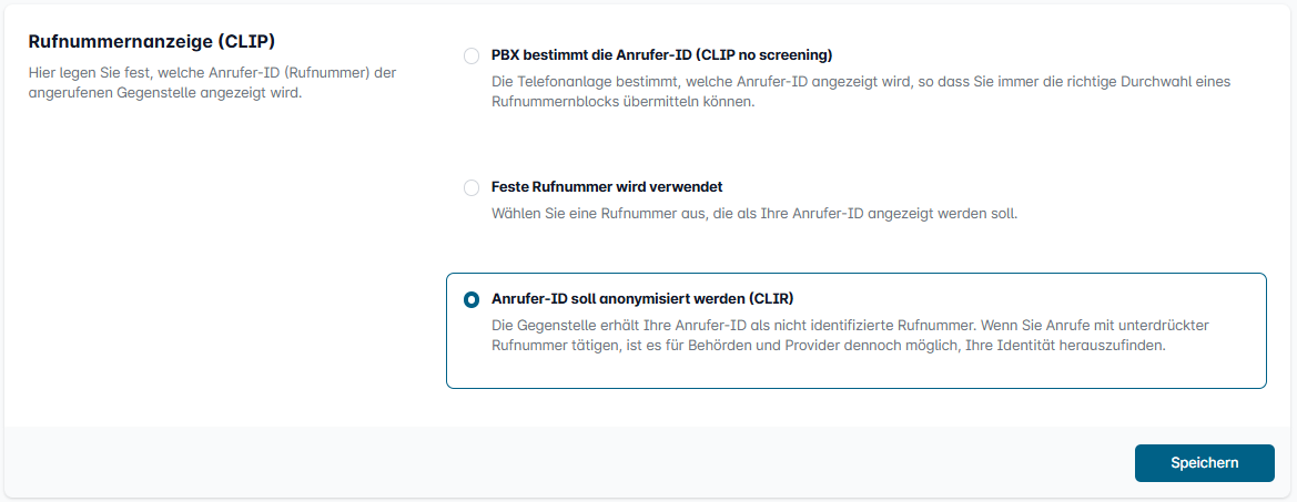 You can also generally prevent the number from being displayed. Please note, however, that most VoIP-capable end devices and telephone systems offer the option of case-by-case number suppression. This allows you to flexibly set on the telephone whether you want to anonymize the phone number.