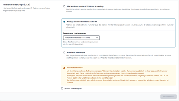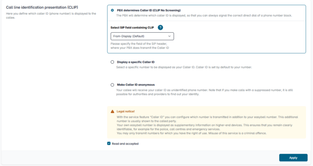 This setting is useful if you use a telephone system that manages all phone numbers and extensions. Rules are then defined for outgoing calls as to which information is signaled to the called party in which situation. Thanks to CLIP no screening, the telephone system can transmit any of your phone numbers with or without extension. You can also signal numbers that are not (yet) with easybell (as long as you have the rights to use them).