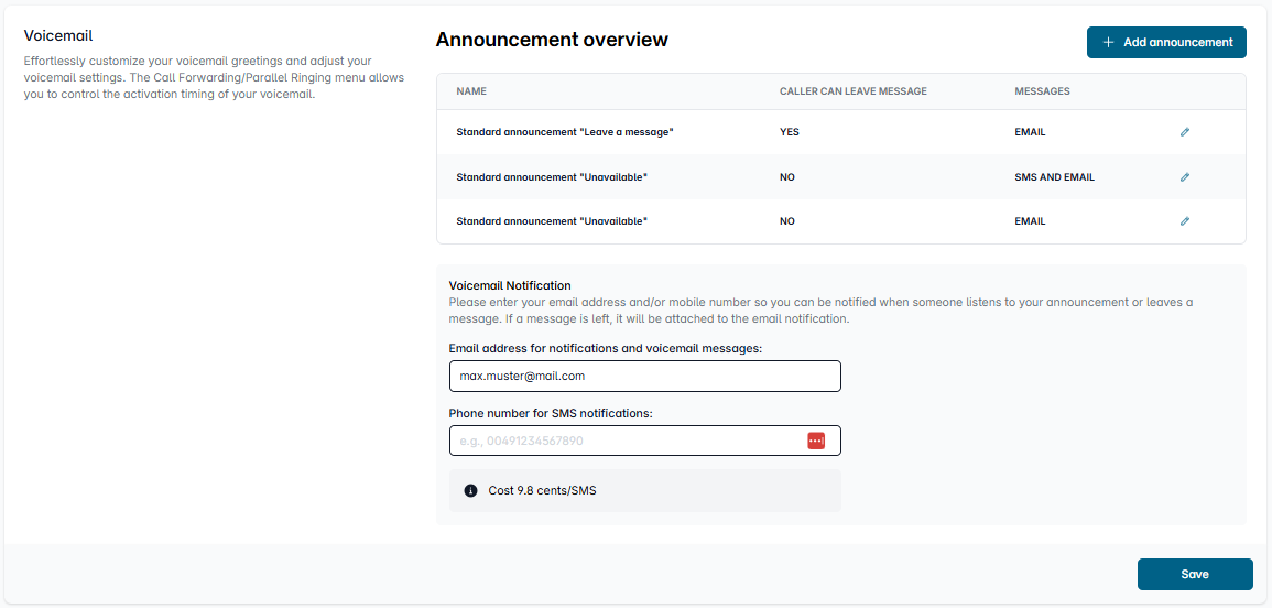 You should also enter your contact details here to be notified of missed calls and to receive messages from callers.