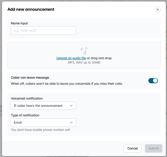 To add your custom greeting, upload your desired audio file in **MP3** or **WAV** format (max. 50 GB) in the designated field.