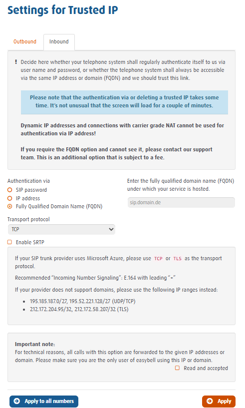 A Fully Qualified Domain Name (FQDN) is a complete and globally unique domain name, such as sip.mycompany.com. It replaces the IP address in authentication and makes your configuration much more flexible. Especially when public IP addresses change (for example in cloud environments or with dynamic connections), authentication remains stable as long as the FQDN points to the correct IP address in the DNS.