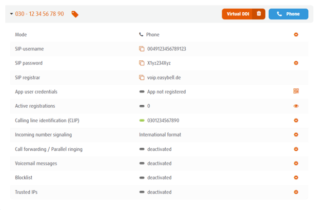 Open the settings overview for your phone number by clicking on the cogwheel next to Trusted IPs.