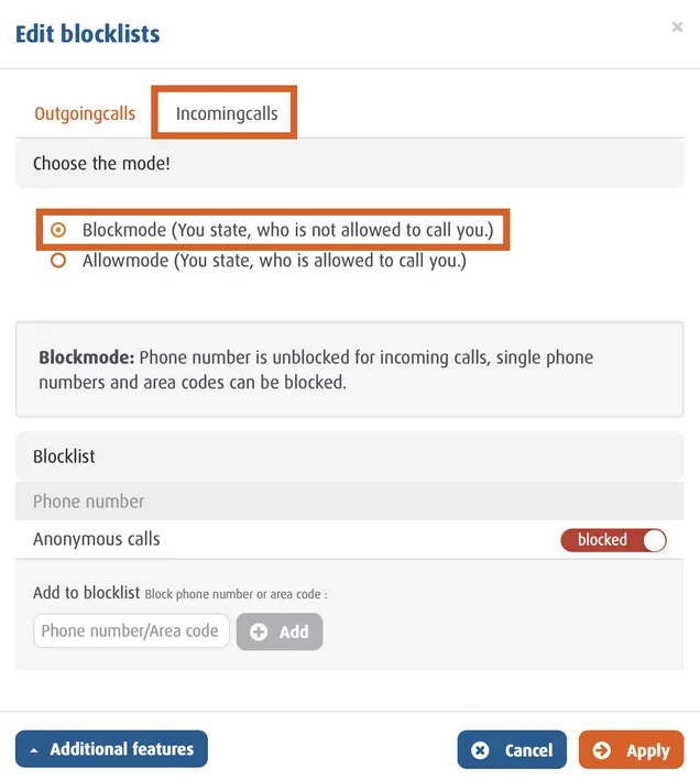Function: Certain phone numbers or phone number ranges (e.g. also anonymous calls) are no longer put through to the phone number.