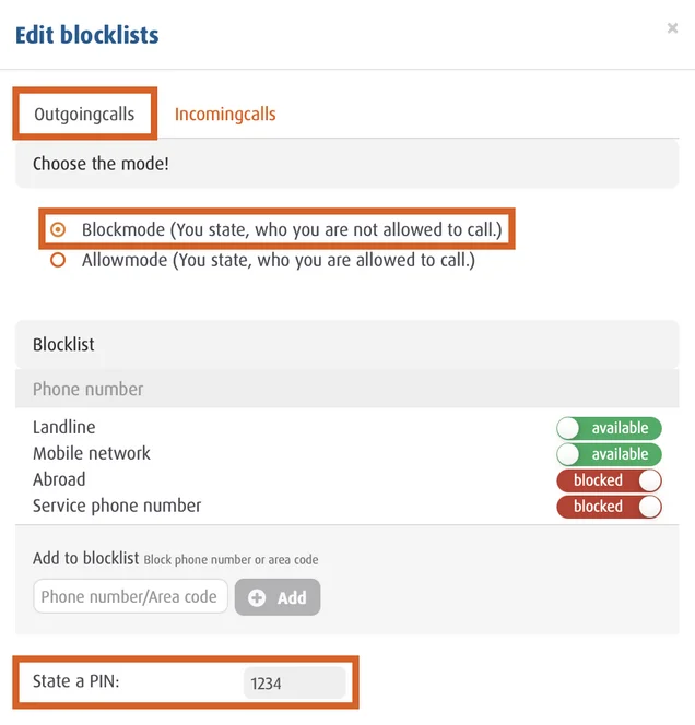Function: The line is generally unblocked for outgoing calls. Only phone numbers or area codes you have defined cannot be called. A PIN can be used to bypass the block for individual calls.